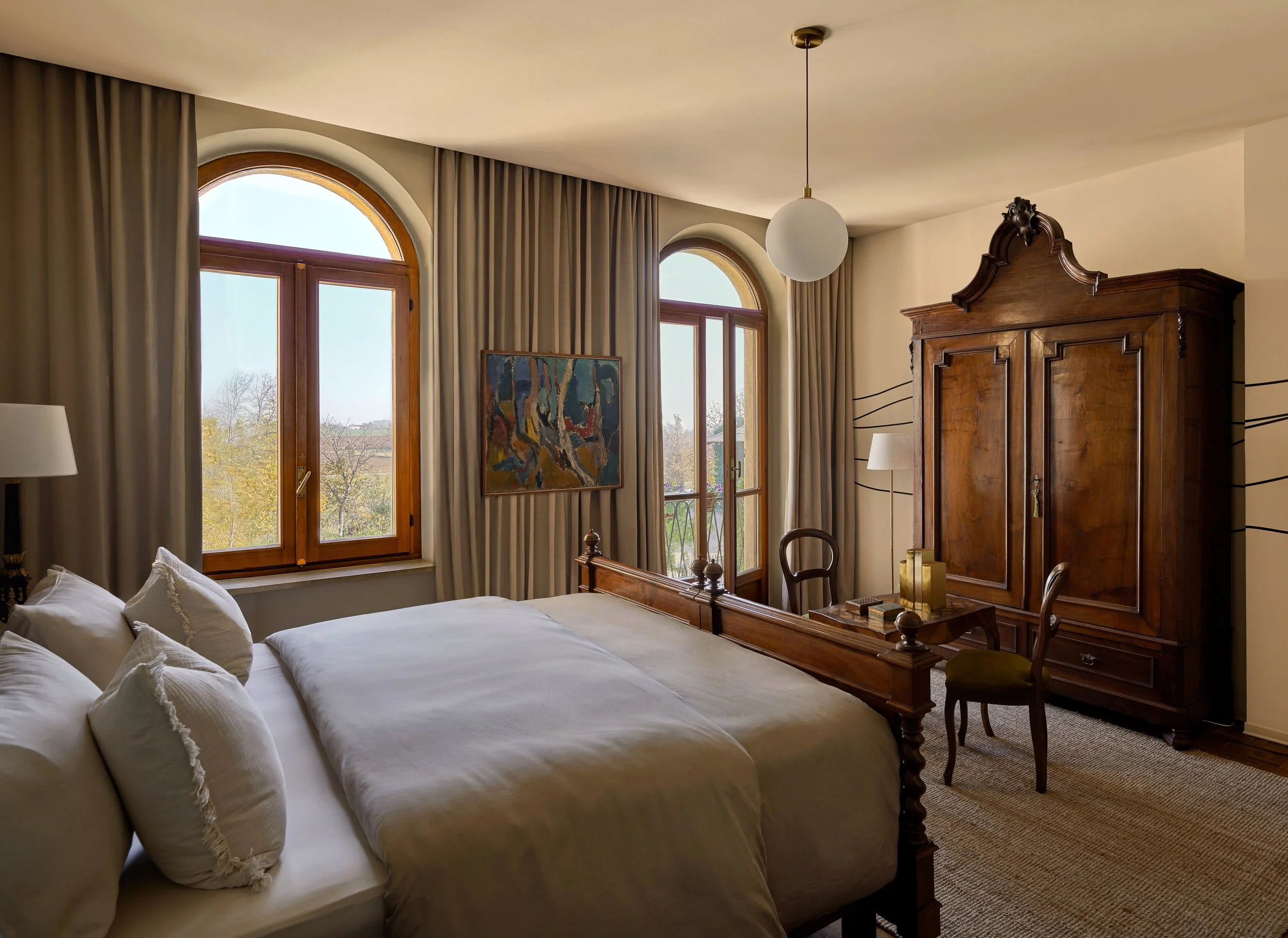 Located on the second floor, La Vilma Suite features two private balconies with views of Monviso and the Italian Alps with a sumptuous king bed dressed in fine linens, down or synthetic pillows and down comforters. The bathroom includes a large pedestal sink, bidet, a deep soaking tub and rain shower. Perfect for solo travelers, couples, or families, La Vilma is 460 square feet and offers a spacious living room with a wardrobe, a secretary cabinet, a dresser, and a plush sofa bed for one additional adult or two children (upon advance request).